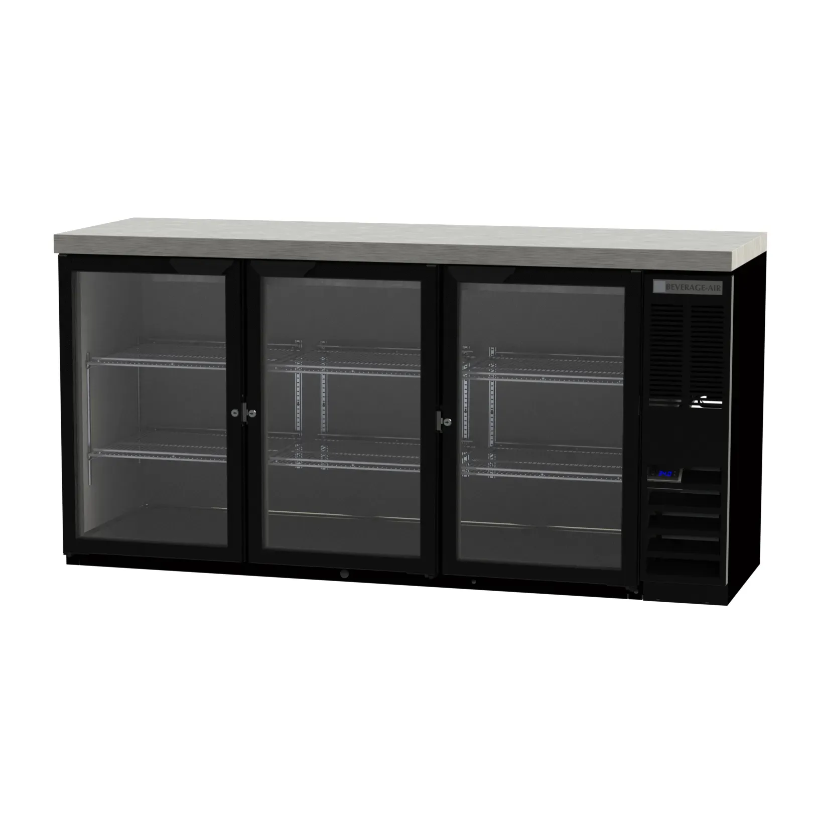 Introducing the Beverage Air BB72HC-1-G-B-27 Back Bar Cabinet, Refrigerated. Dominate the culinary world with this top-of-the-line refrigerated storage cabinet. Designed by Beverage Air, a trusted name in commercial refrigeration, this three-section cabinet offers a spacious 19.92 cu. ft. capacity, perfect for storing and showcasing your beverages. The cabinet features three glass doors with locks, ensuring the security of your valuable inventory. With six epoxy coated steel shelves, you can easily organize and access your products. The LED interior lighting, with a manual on/off switch, illuminates the cabinet, making it easy to locate items. The 2" stainless steel top provides a durable workspace for bartenders and servers. The black exterior finish adds a sleek and modern touch to any restaurant decor. Made in the USA, this back bar cabinet is cULus and UL-Sanitation certified, guaranteeing its quality and safety. Upgrade your restaurant with the Beverage Air BB72HC-1-G-B-27 Back Bar Cabinet, Refrigerated, and experience the convenience and efficiency it brings to your establishment.