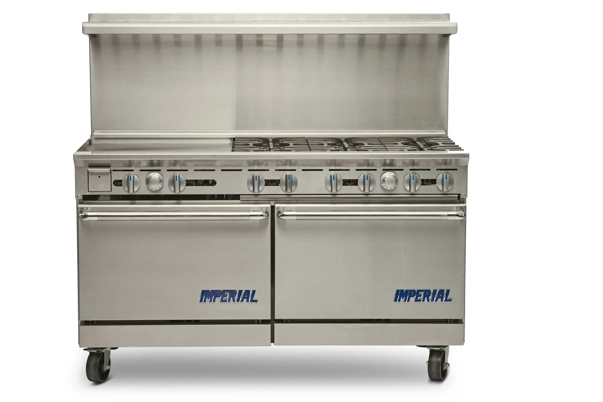 Cooking at its finest with the Imperial IR-2-G48-CC Range, 60" Restaurant, Gas. This top-of-the-line restaurant range is designed to meet the demands of a busy commercial kitchen. With two open burners, a 48" griddle, and two convection ovens, this range offers versatility and efficiency. The three chrome racks per oven provide ample space for cooking multiple dishes at once. The 3" grease trough, removable grease can, and crumb tray make cleaning a breeze, ensuring a hygienic cooking environment. Made with stainless steel front, sides, backguard, shelf, landing ledge, and kick plate, this range is built to withstand the rigors of a commercial kitchen. The adjustable feet and 6" legs provide stability and flexibility. With a powerful 204,000 BTU output and NSF, CE, CSA Flame, and CSA Star certifications, this range is a reliable and safe choice for any restaurant. Upgrade your kitchen with the Imperial IR-2-G48-CC Range and experience professional-grade cooking performance.