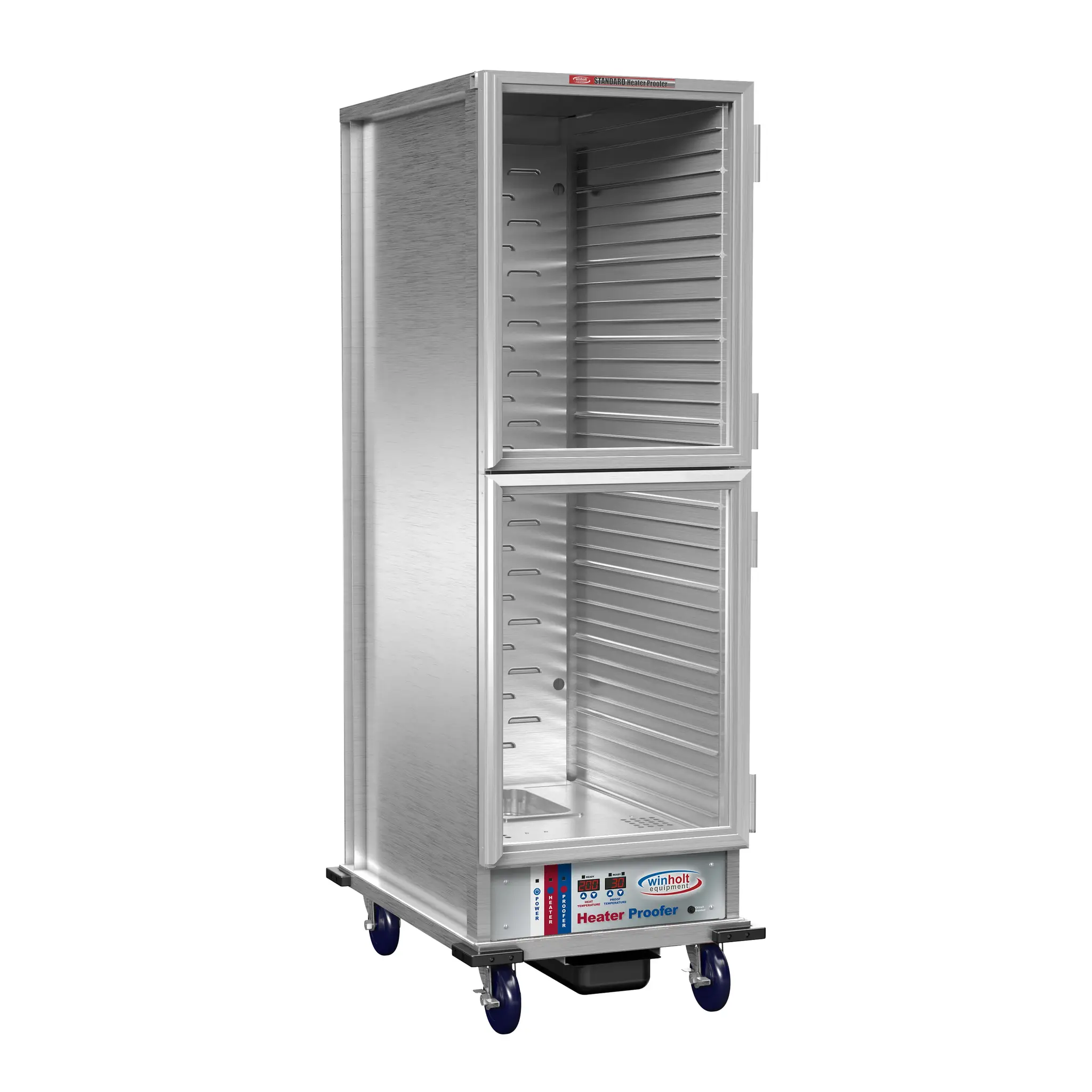Improve kitchen workspace functionality with the Winholt NHPL-1833-ECOC-2D Proofer Cabinet. This mobile, non-insulated economy heater/proofer cabinet is designed to meet the demands of a commercial restaurant setting. With its full height and aluminum construction, it provides durability and ample space for accommodating up to 33 18" x 26" pans. The forced air feature ensures even heat distribution, while the dual proof/heat control allows for precise temperature regulation. The lift-off clear dutch doors provide easy access to the contents, and the removable analog control drawer offers convenience. The LED thermometer display allows for quick temperature monitoring. Equipped with swivel casters, including two with brakes, this cabinet is easy to maneuver and secure in place. With its cETLus and NSF certifications, this Winholt Proofer Cabinet guarantees quality and compliance with industry standards. Upgrade your restaurant's food preparation and storage capabilities with this reliable and efficient proofer cabinet.